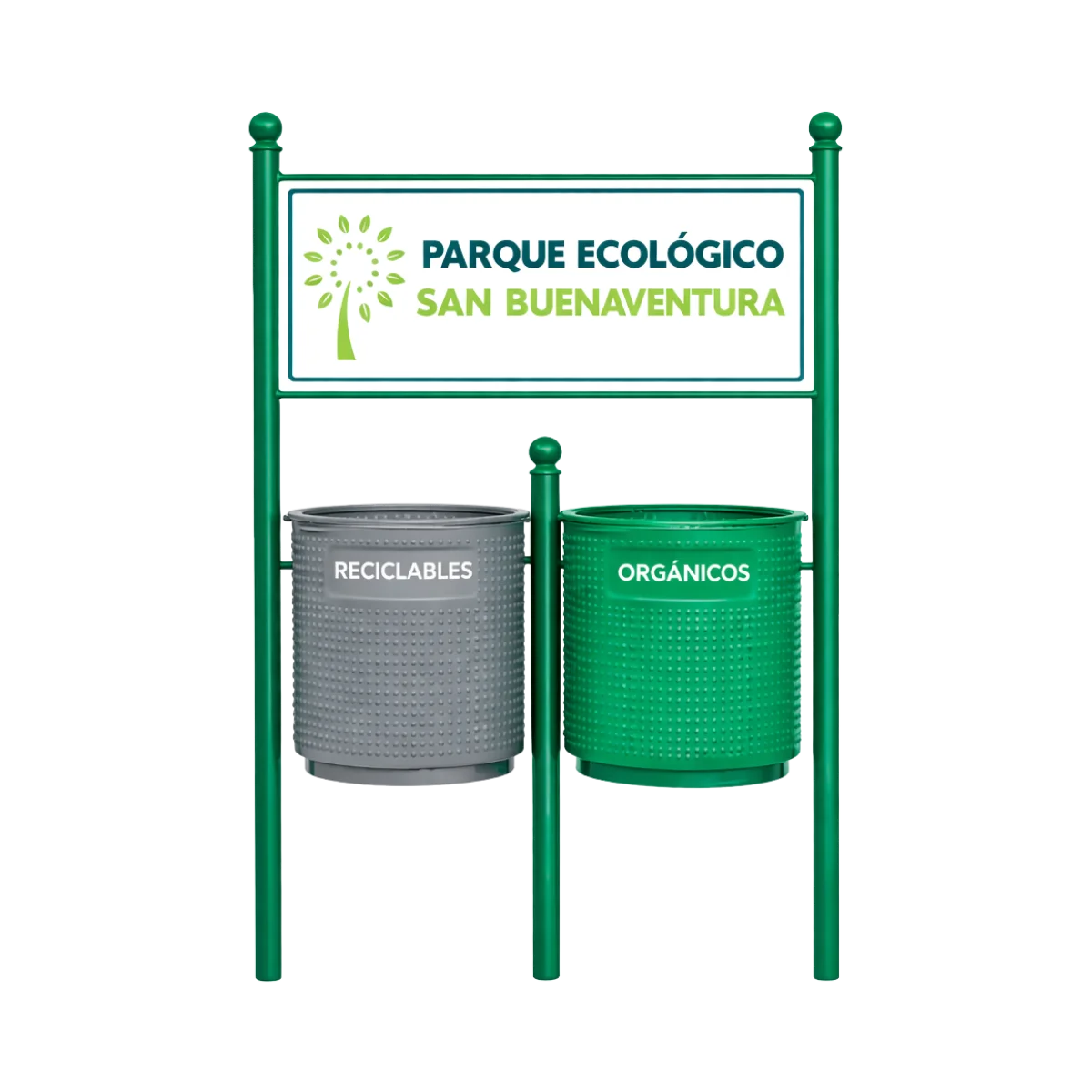 Los Botes de basura para parques están fabricados en polietileno de media densidad, un material altamente resistente y duradero. Cuentan con una estructura metálica robusta de 2 ½” calibre 18, refuerzos macizos de ½” y base tubular, lo que garantiza estabilidad, larga vida útil y un excelente desempeño en espacios públicos y urbanos.