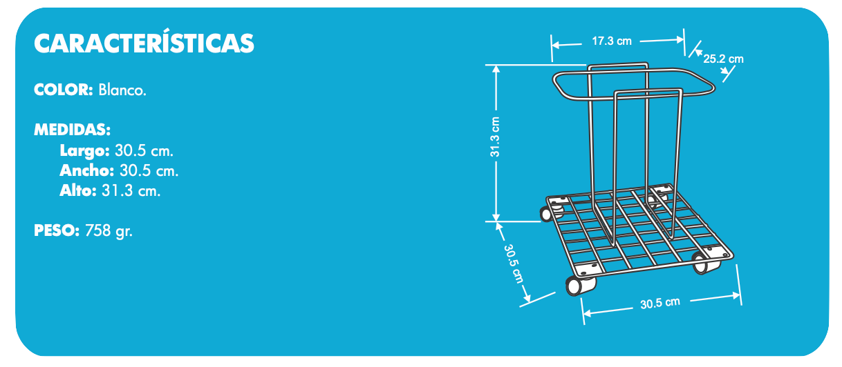 Con dimensiones compactas (30.5 cm de largo, ancho y 31.3 cm de alto) y un peso ligero de solo 758 gramos, la canastilla es fácil de maniobrar y almacenar, lo que la convierte en un accesorio práctico y eficiente en cualquier espacio.