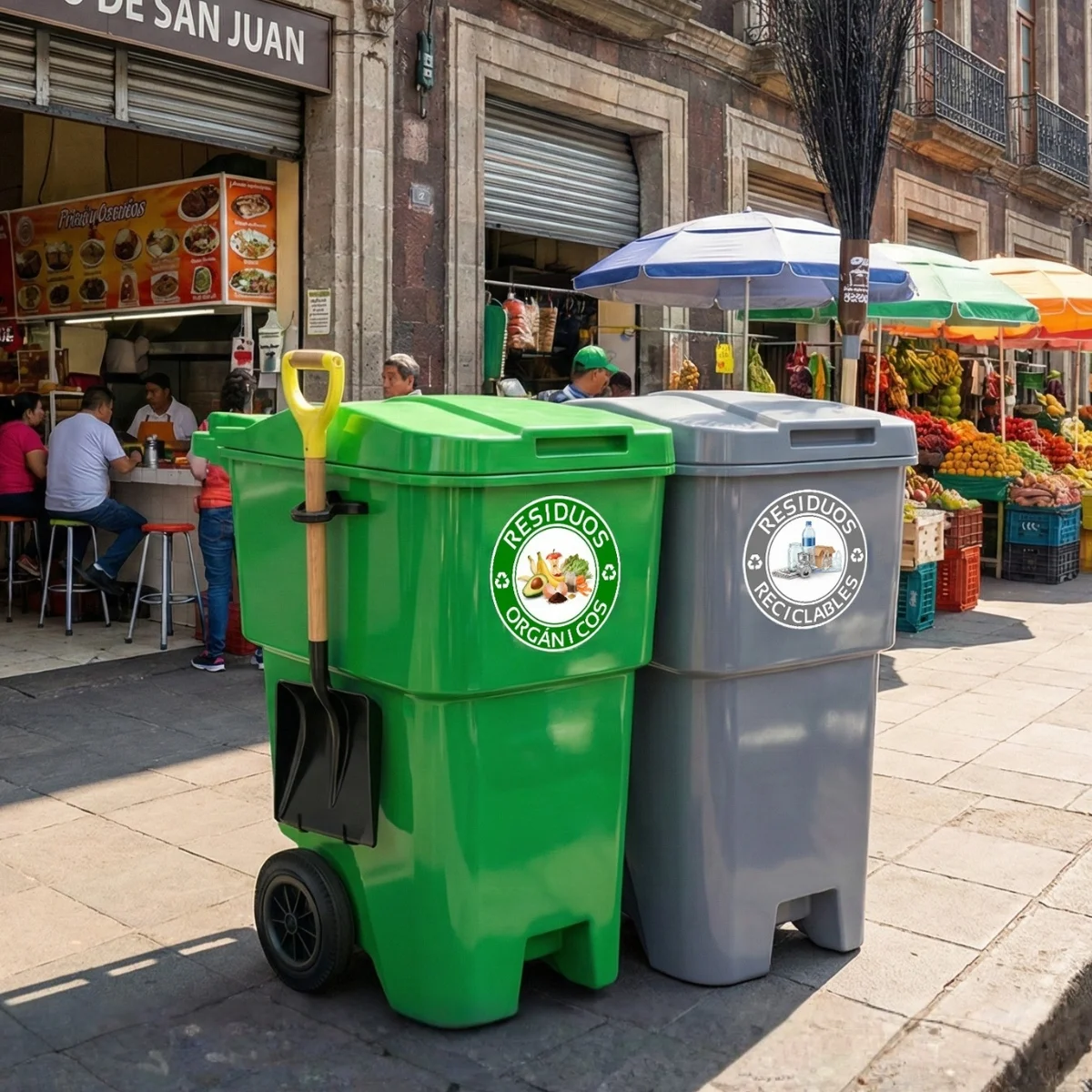 Su estructura está fabricada en polímero de alta resistencia, material que soporta golpes, fricción y uso continuo sin perder estabilidad. Esta característica permite que el equipo mantenga su desempeño en distintos entornos urbanos, desde banquetas y parques hasta corredores comerciales o zonas de alto tránsito. Gracias a esta construcción, el contenedor conserva su firmeza incluso durante jornadas prolongadas de trabajo.