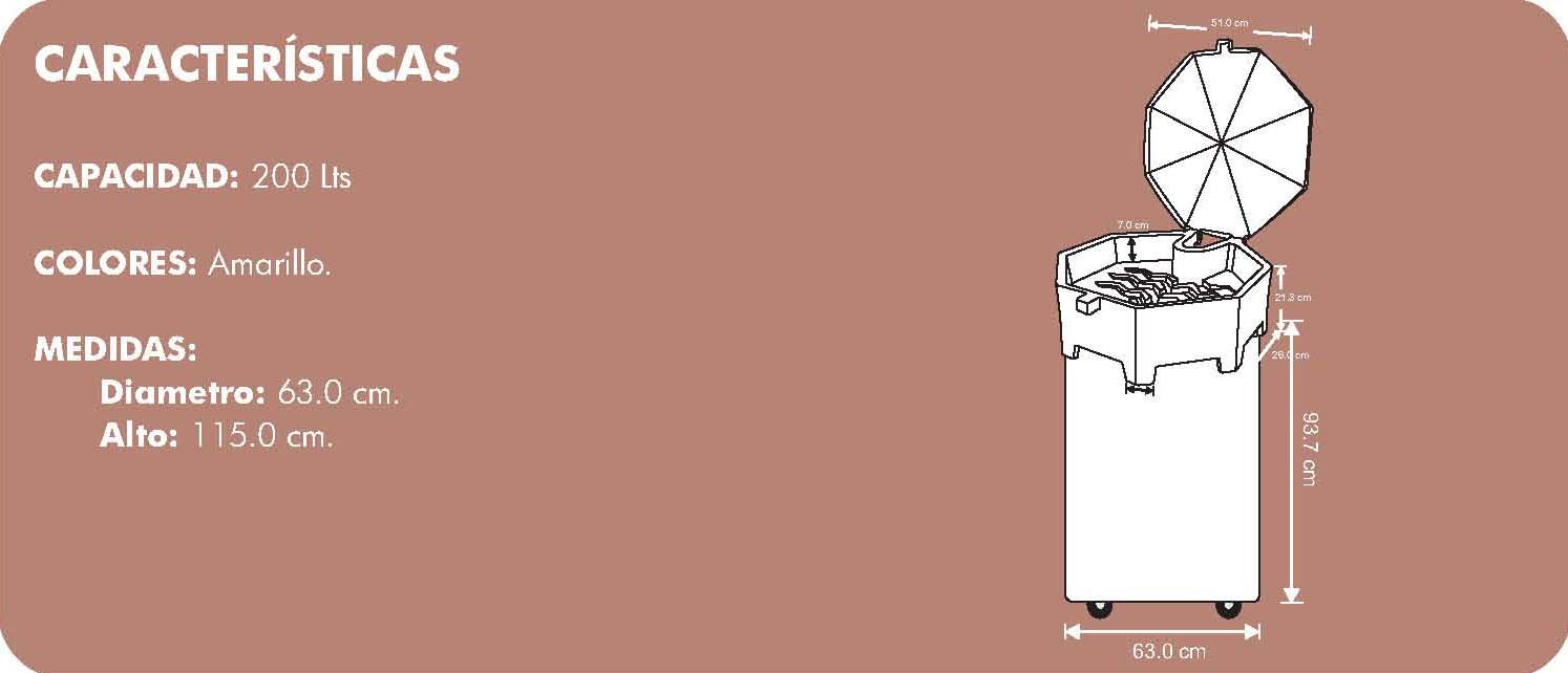 ♻ El contenedor esta compuesto por 2 piezas: un bote de 200 lts. con ruedas y tapa que funciona como embudo para llenar el contenedor.