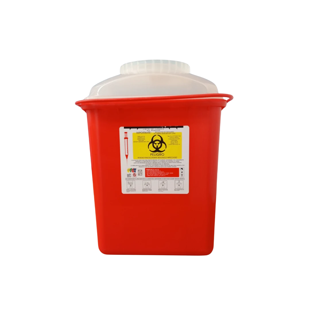 El Contenedor de Contenedor de Punzocortantes PC-8.44 es rígido y seguro al estar fabricado el polímero, resistente a perforaciones y con un sellado seguro para evitar derrames o exposiciones accidentales. Con capacidad de hasta 10 litros, aunque se recomienda su llenado hasta el 80% para un mejor manejo.