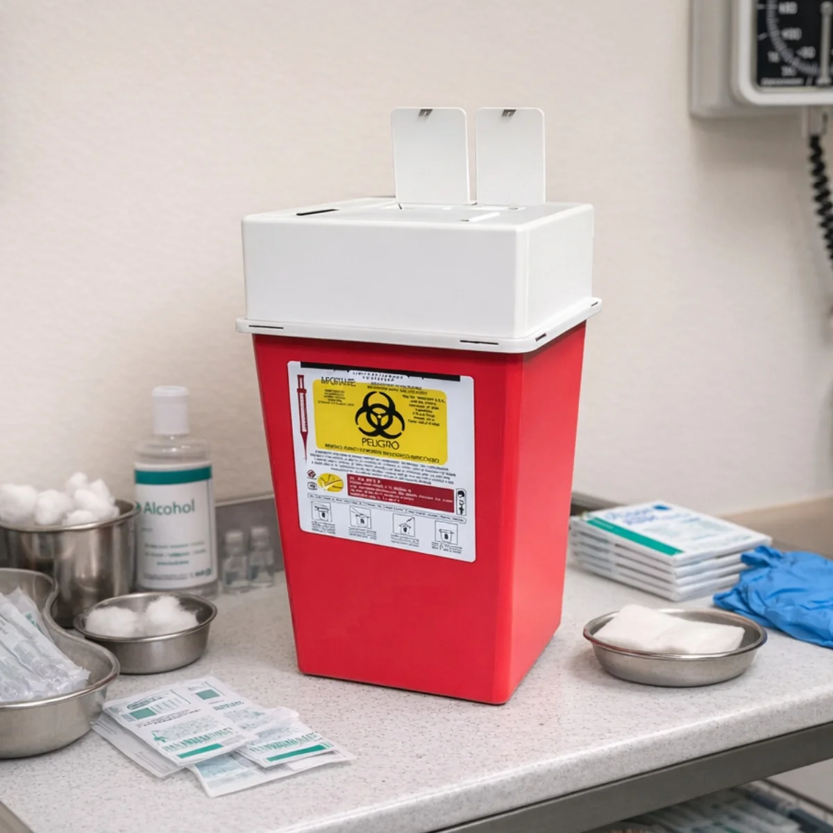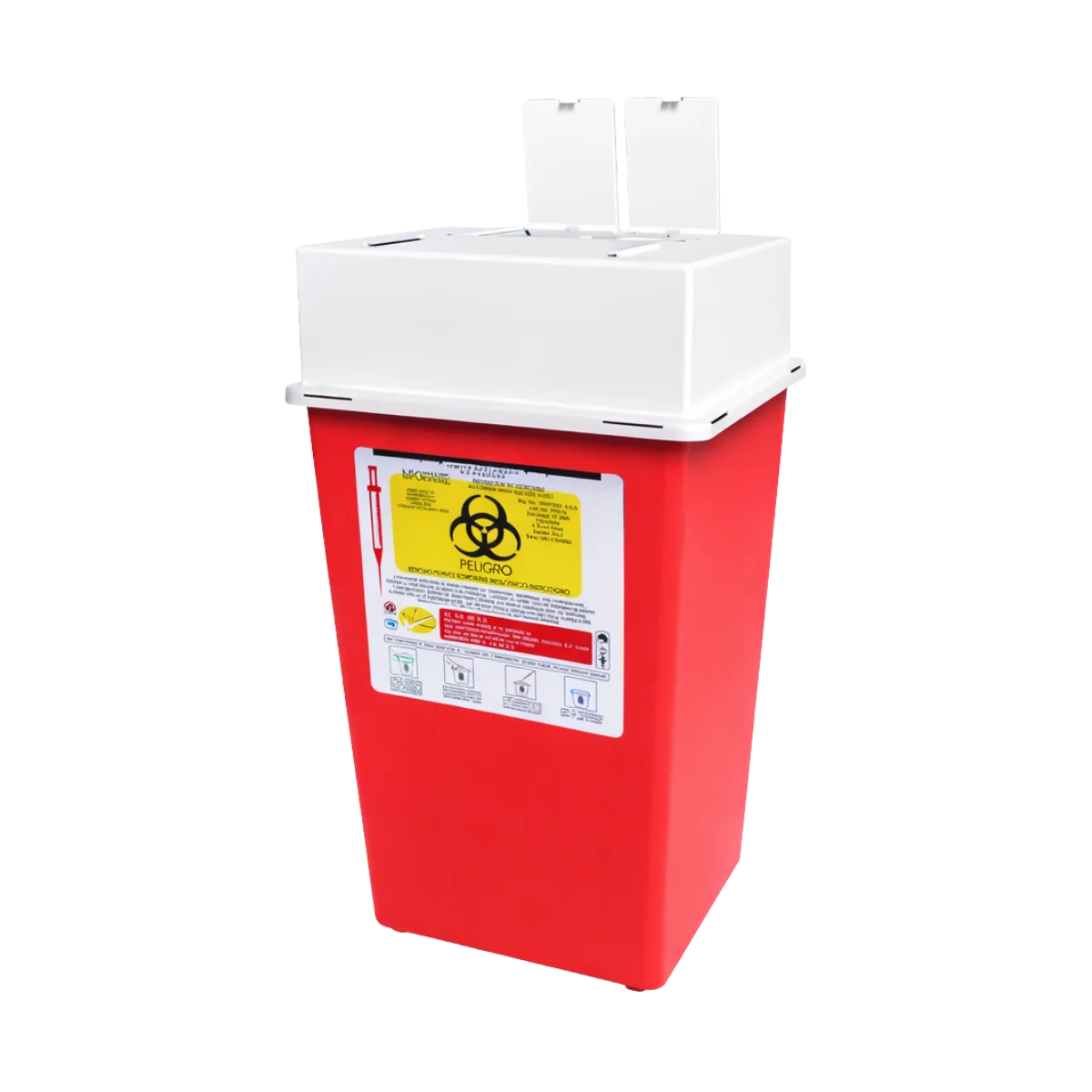 Pero eso no es todo. Este contenedor no es un simple accesorio médico; es un garante de protección. Está etiquetado con la leyenda “Residuos Peligrosos Punzocortantes Biológicos Infecciosos” y marcado con el símbolo universal de “Riesgo Biológico”, lo que advierte de manera clara y visible sobre el peligro que representan sus contenidos.