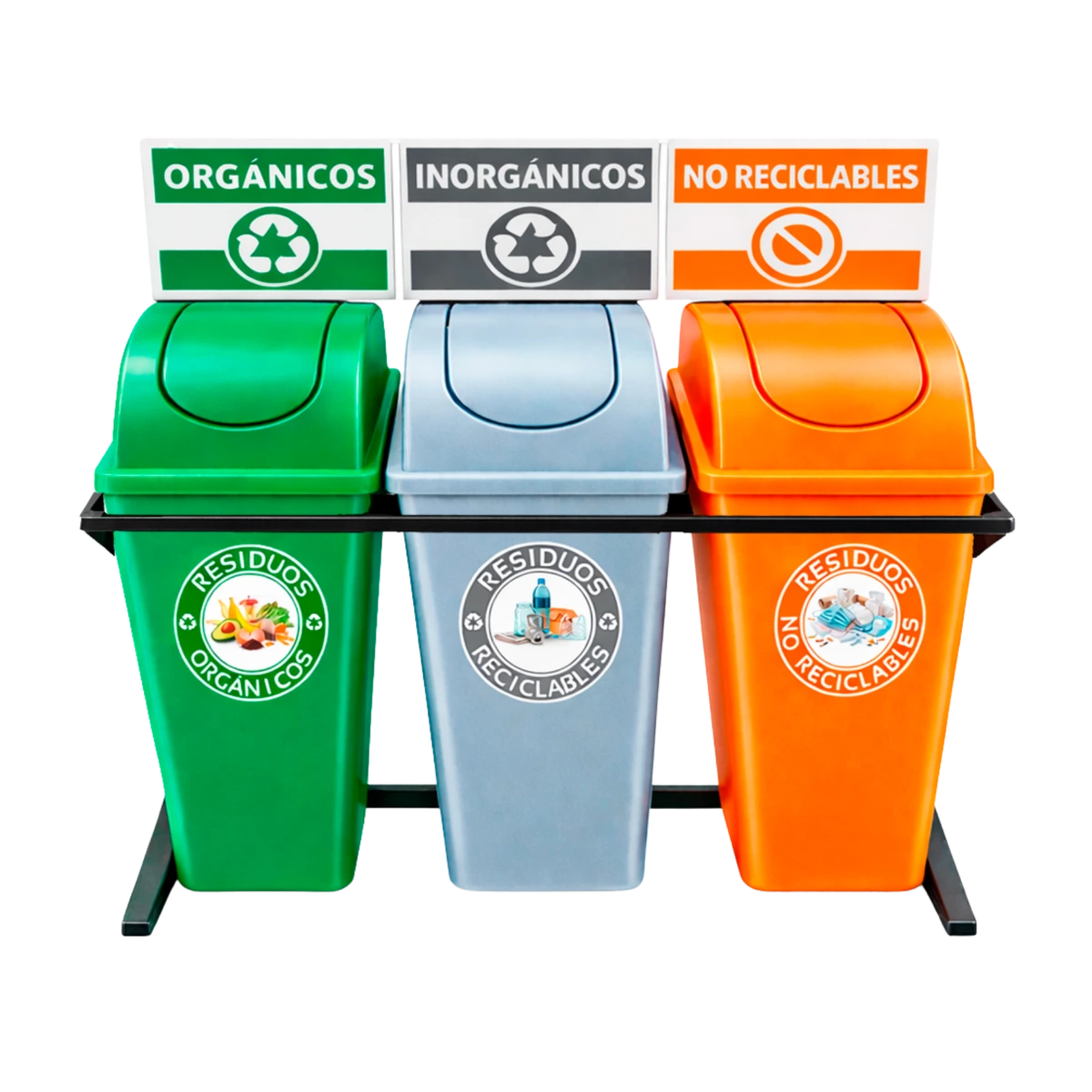 Su diseño responde a una necesidad muy concreta: organizar la separación de residuos sin generar confusión ni ocupar más espacio del necesario. Los contenedores se integran en una estructura alineada que permite identificar cada tipo de residuo de manera inmediata. Gracias a la señalización por color y etiquetas visibles, las personas reconocen rápidamente dónde depositar cada material, lo que agiliza el proceso y mejora la organización del entorno.