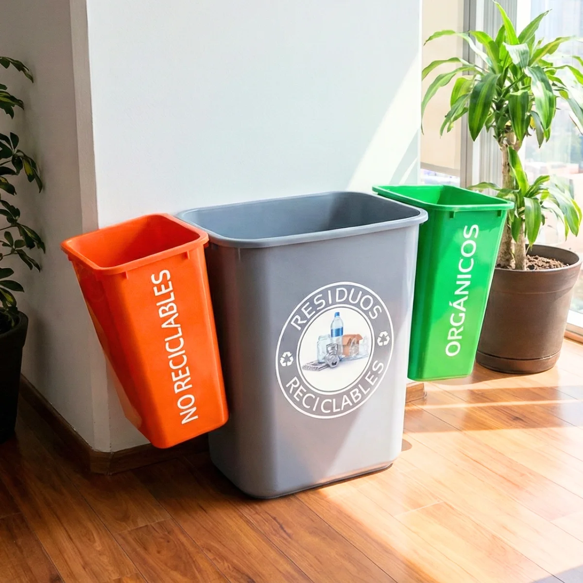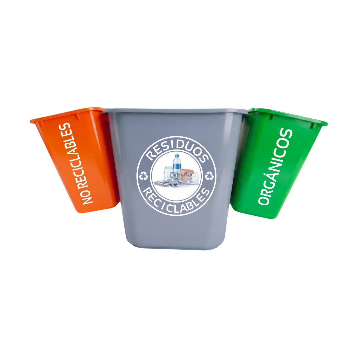 Los ganchos de plástico permiten unir los botes de forma segura, manteniendo el conjunto estable y ordenado. Gracias a este sistema, cada recipiente conserva su posición y función, lo que ayuda a evitar confusiones al momento de depositar los residuos. Además, existe la opción de agregar más botes, lo que permite ampliar la separación según las necesidades del lugar.